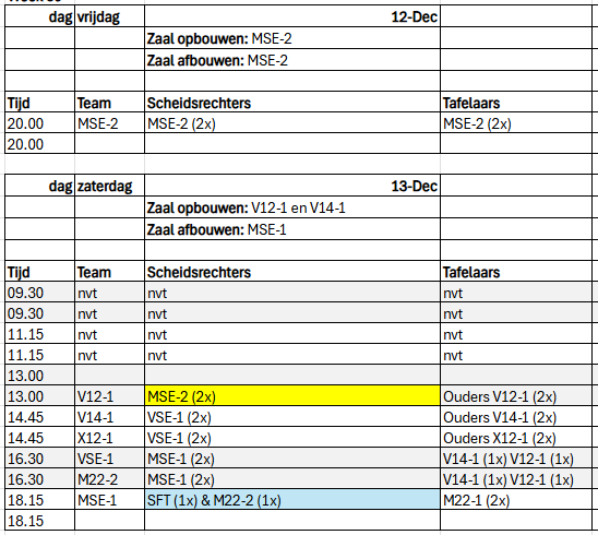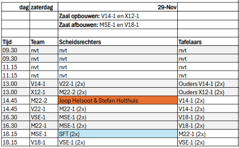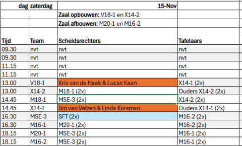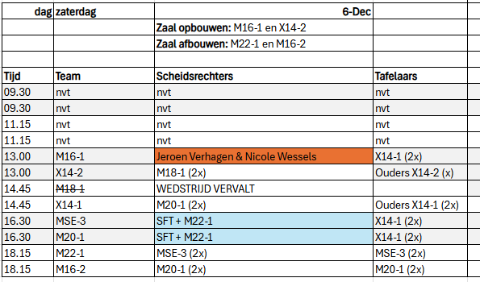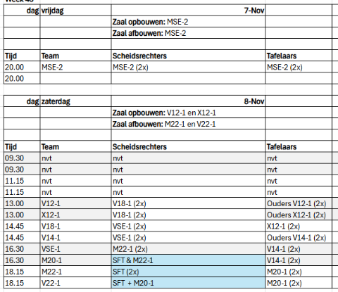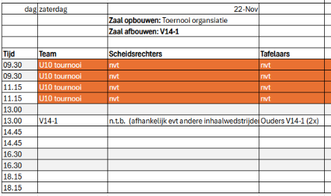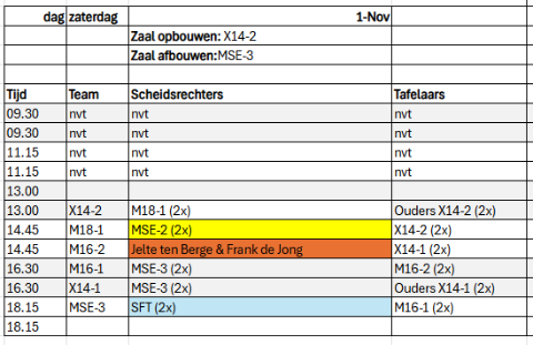 Hieronder staan de zaaldiensten voor alle thuiswedstrijden van het seizoen. Als je naam of team hier staat, verwachten we dat je aanwezig bent. Lukt dat niet, dan ben je er zelf verantwoordelijk voor om een vervanger te regelen. Je team coördinator (en/of coach) kan hier eventueel bij helpen. Het meest logische is natuurlijk om te kijken of je kunt switchen met iemand uit je eigen team. Lukt dat niet? Kijk dan welk team rond hetzelfde tijdstip thuis speelt en vraag (via je coach of team-coördinator) of iemand van dat team jouw beurt kan overnemen. Niet op komen dagen, is uiteraard geen optie. Dat past niet bij KTC :-).