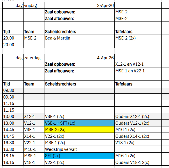 Hieronder staan de zaaldiensten voor thuiswedstrijden. Als je naam of team hier staat, verwachten we dat je aanwezig bent. Als je verhinderd bent, dan ben je er zelf verantwoordelijk voor om een vervanger te regelen. Dat gaat het makkelijkst binnen je eigen team. Lukt dat niet? Kijk dan welk team rond hetzelfde tijdstip thuis speelt en vraag of iemand van dat team jouw beurt kan overnemen. Niet op komen dagen, is uiteraard geen optie. Dat past niet bij KTC :-).