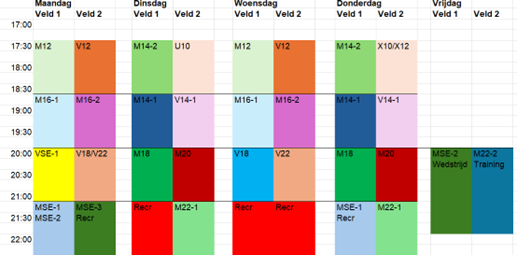 Hieronder staat het trainingsschema voor seizoen (aug) 2025 tm (april) 2026. Er is geen training tijdens schoolvakanties (regio Noord). Als er toch getraind kan worden, hoor je dat via je trainer (jeugd) of coördinator (senioren). Voor de zekerheid: V = vrouwen, M = mannen en X = gemengd. Alle trainingen zijn in de Tetterodehal.